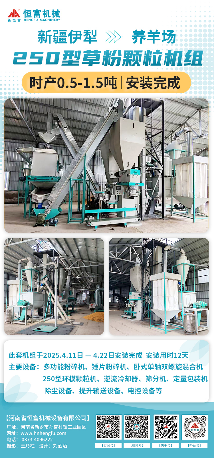 新疆伊犁養羊場,時產0.5-1.5噸250型(xíng)草粉顆粒飼料機組安裝完成。