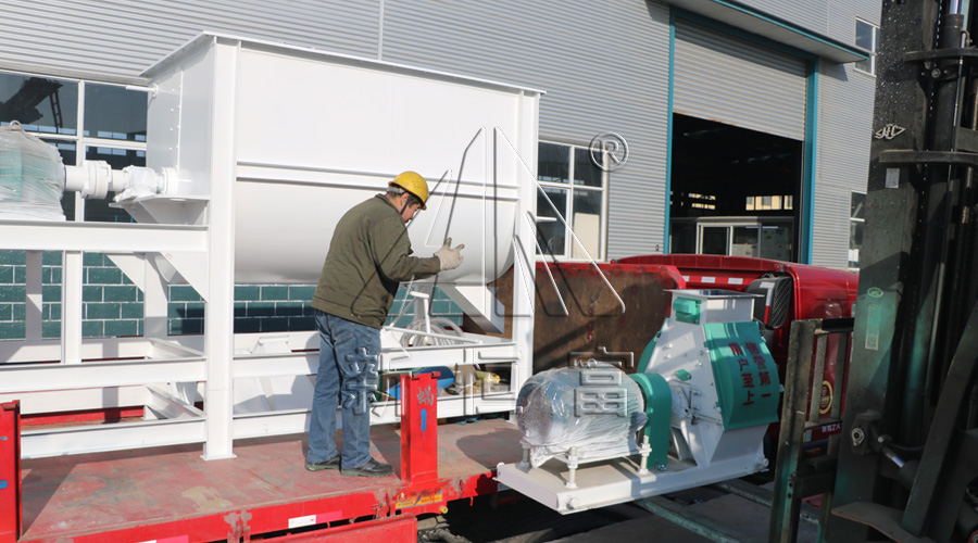 本次發貨的(de)主要設備有:SFSP56*40粉(fěn)碎機(jī)(配置磁選器)、4立方米待(dài)混合倉、臥(wò)式混合機、刹克龍、鬥式提升(shēng)機、螺旋輸送機、1.6*2米小地磅、配電櫃、除塵管道等。