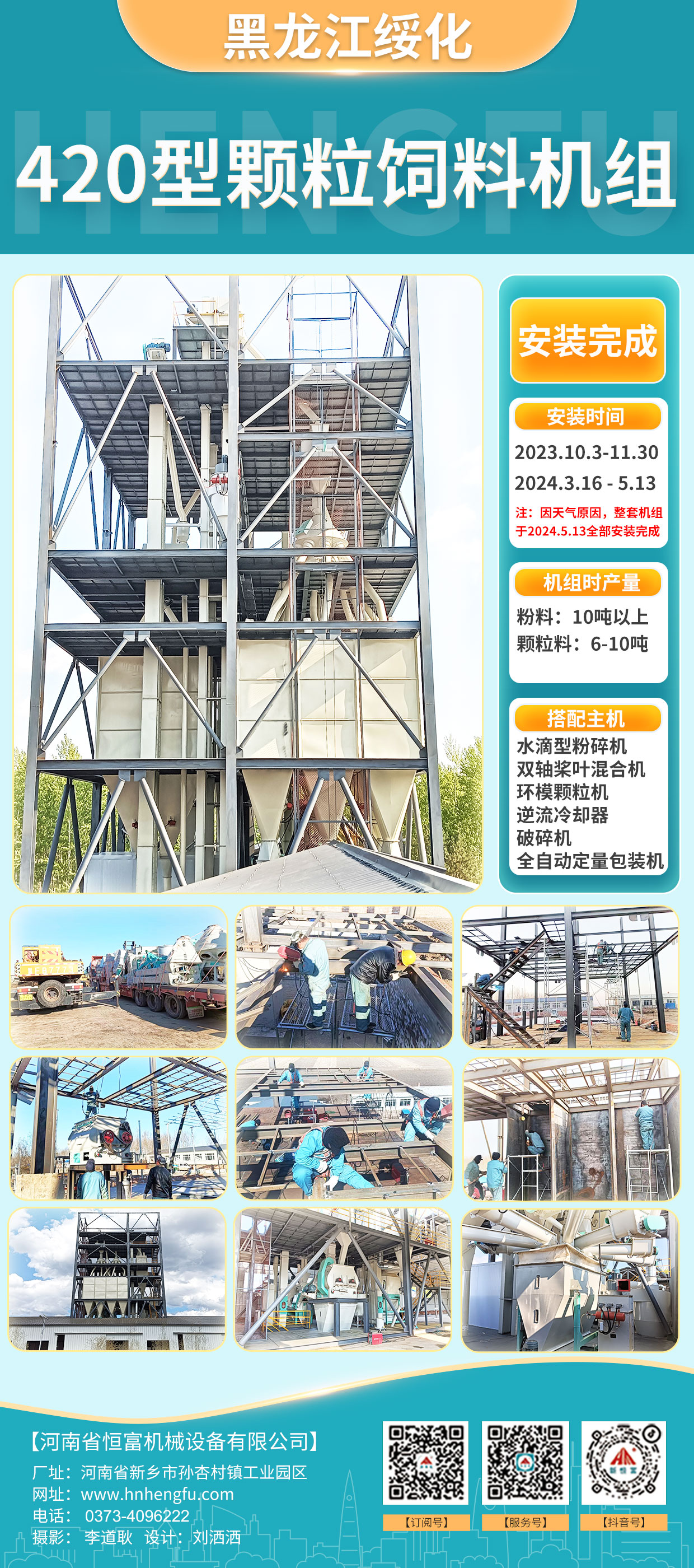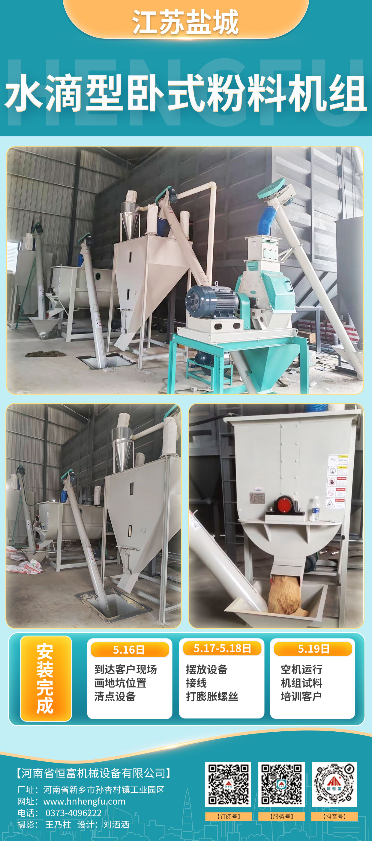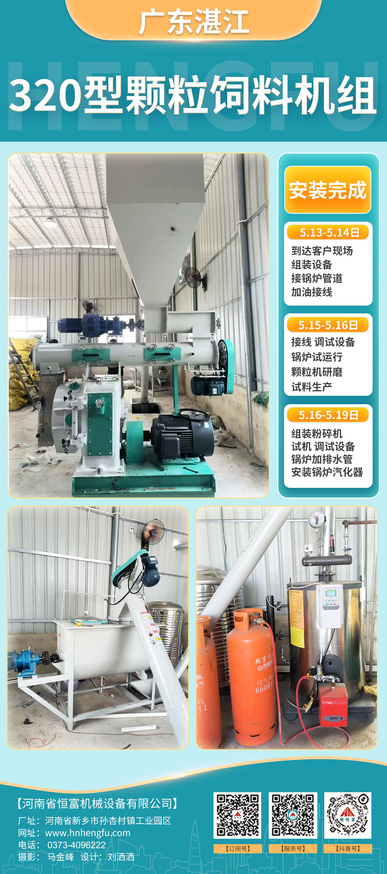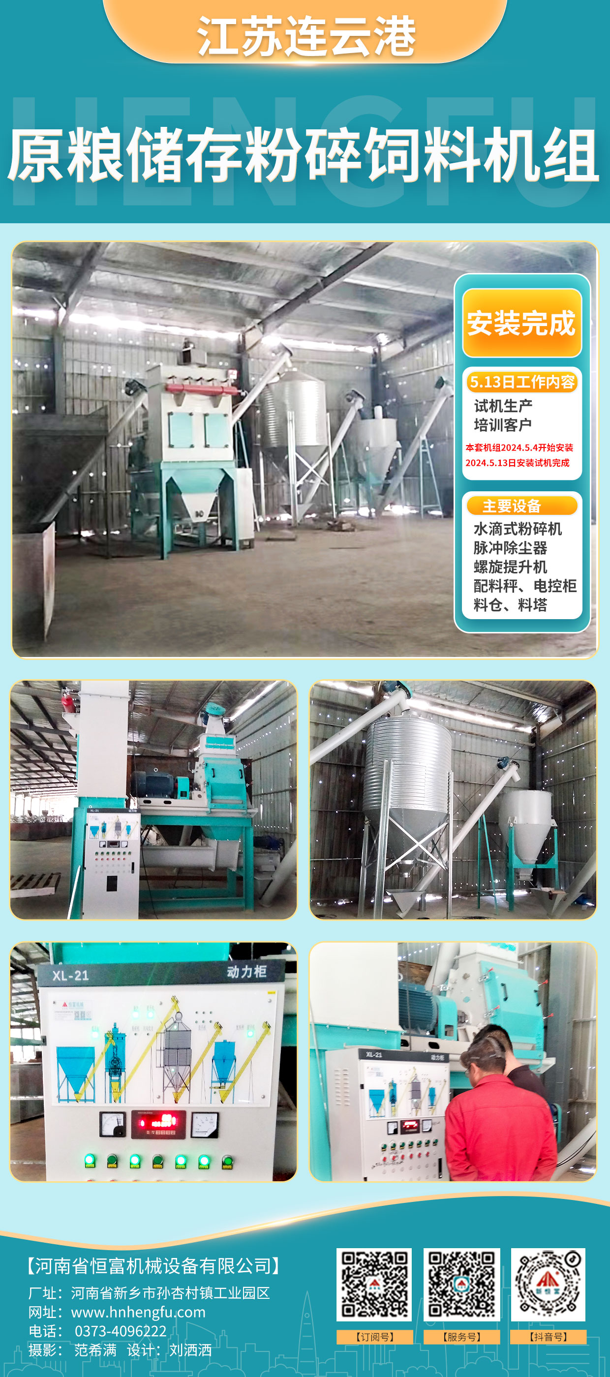 安裝完成的設備:黑龍江綏化420自動配料顆粒機(jī)組、江蘇連雲港原糧儲存粉碎飼料機組、廣東湛江320型顆(kē)粒飼料機組(zǔ)、江蘇鹽城水滴型(xíng)臥式粉狀飼料機組。