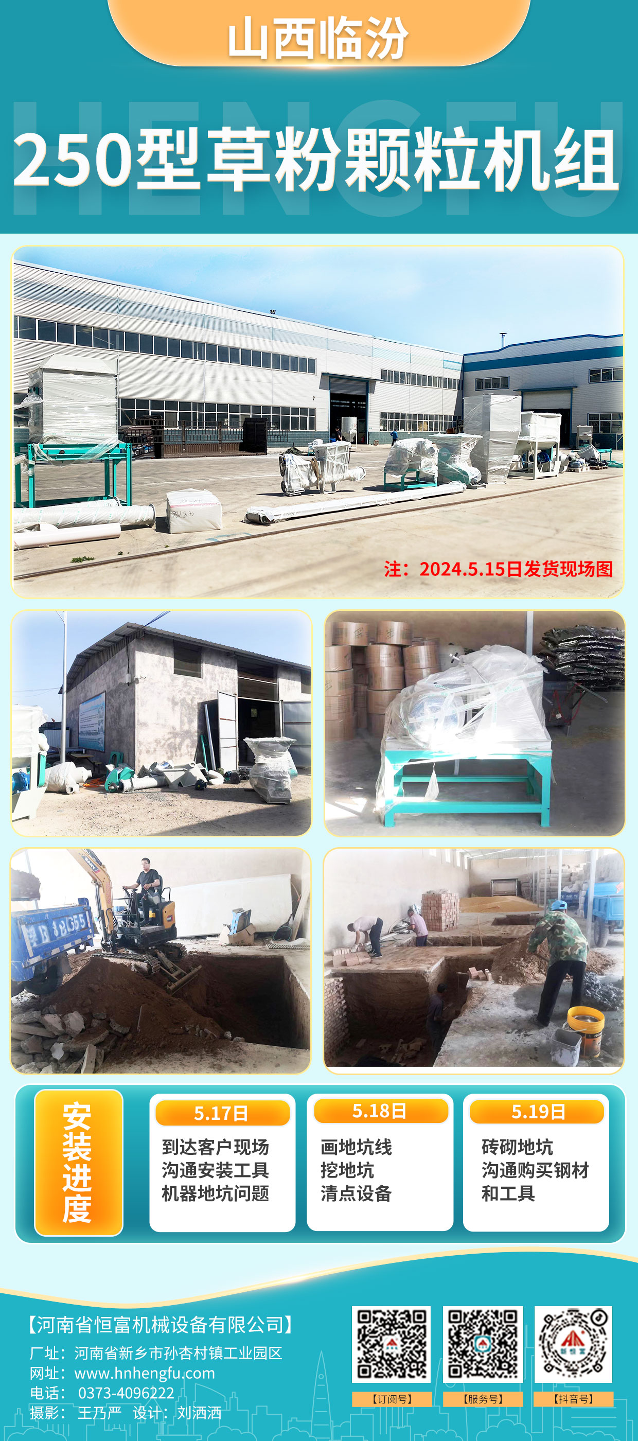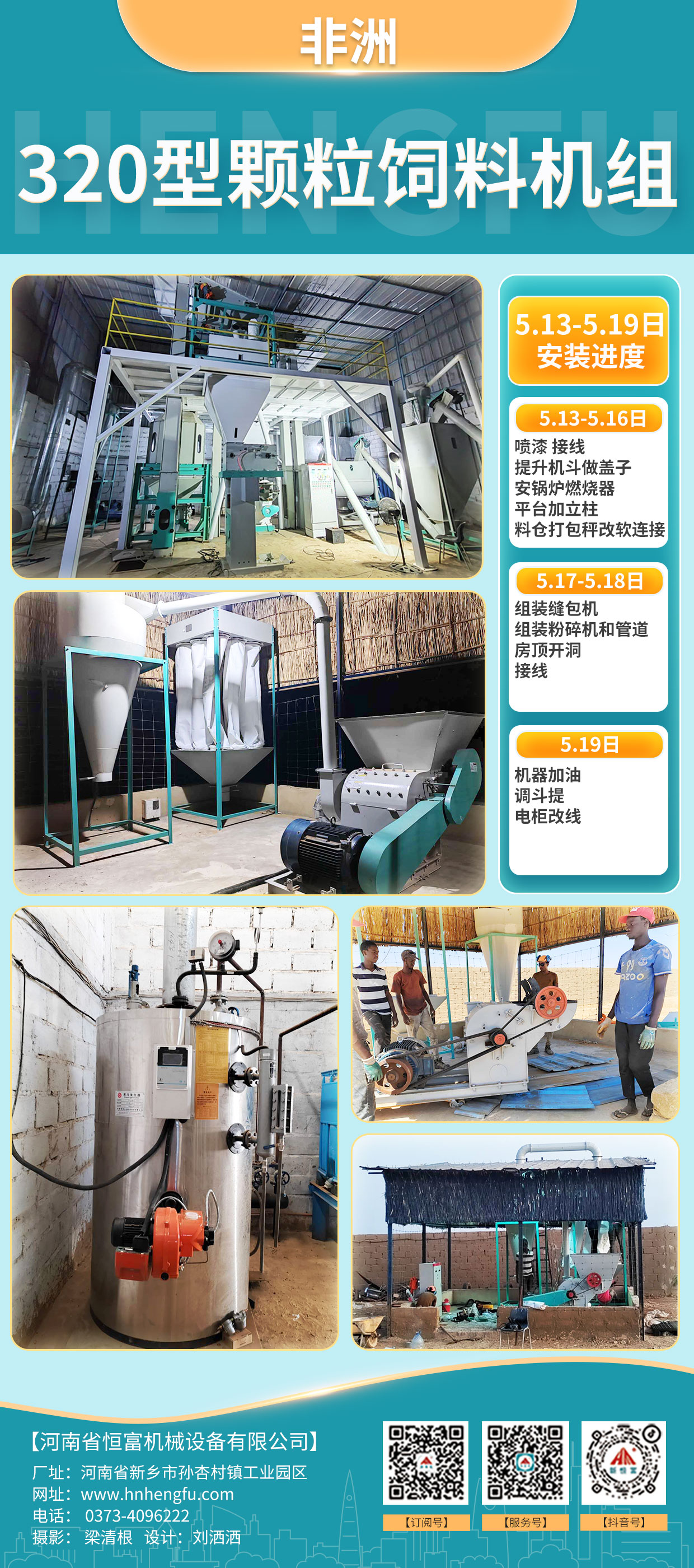 正在安裝的設備:非洲(zhōu)320型顆粒飼料機組、山西臨汾250型草粉顆粒機組。