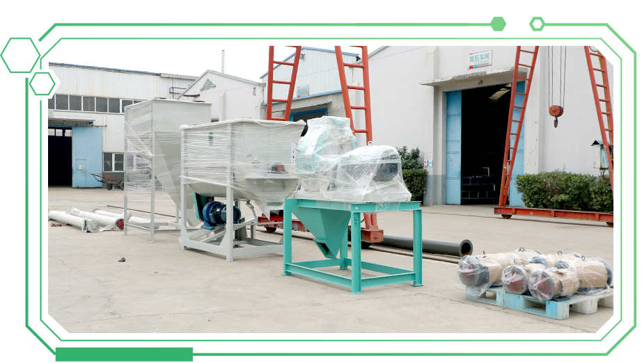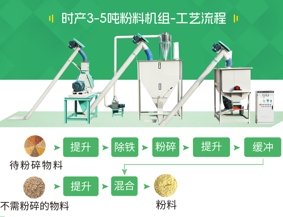 該機組配備的設備有:水滴式粉(fěn)碎機、緩(huǎn)衝倉、單軸雙螺旋混合機(jī)、提升輸(shū)送設備、除(chú)塵除(chú)鐵設備(bèi)、電控係統、配件等。