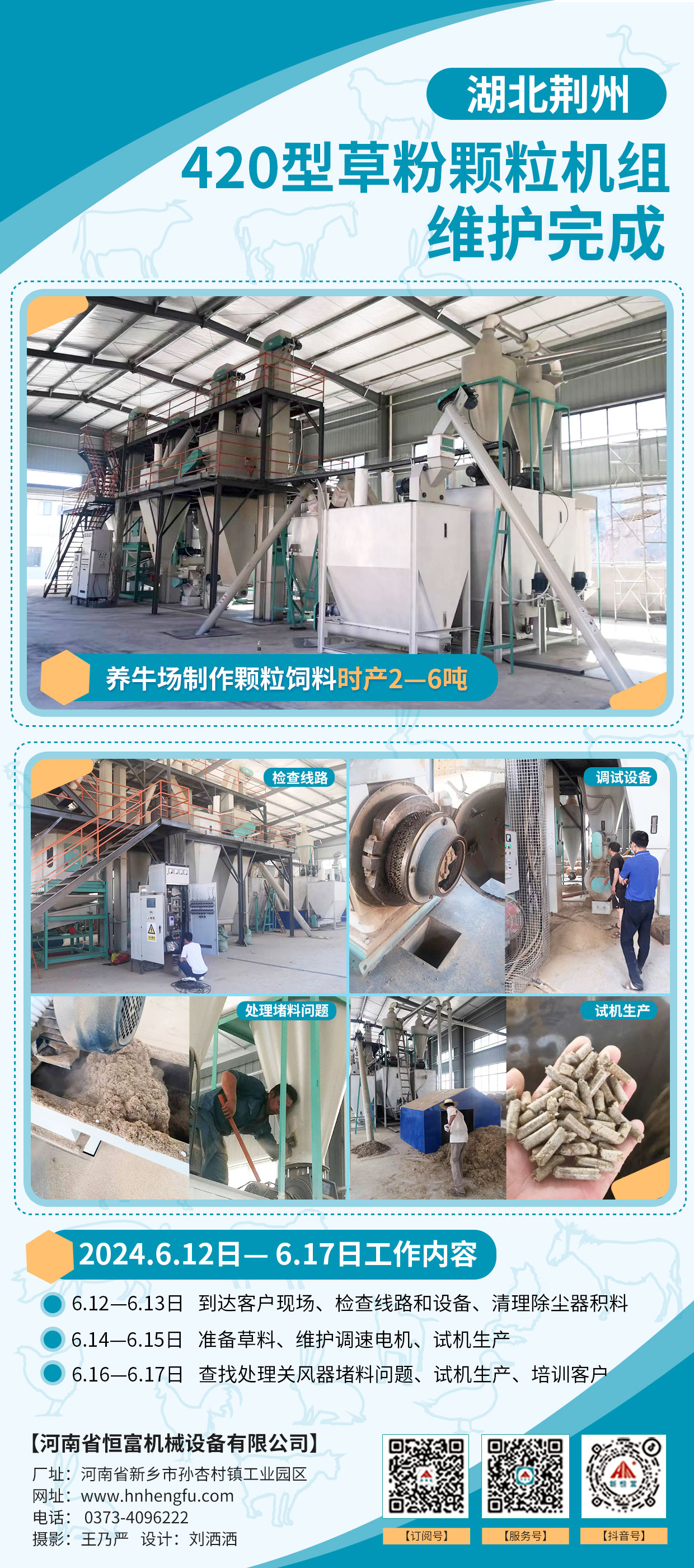 維護完(wán)成的設備:湖北荊州420型草粉(fěn)顆粒飼料機組。