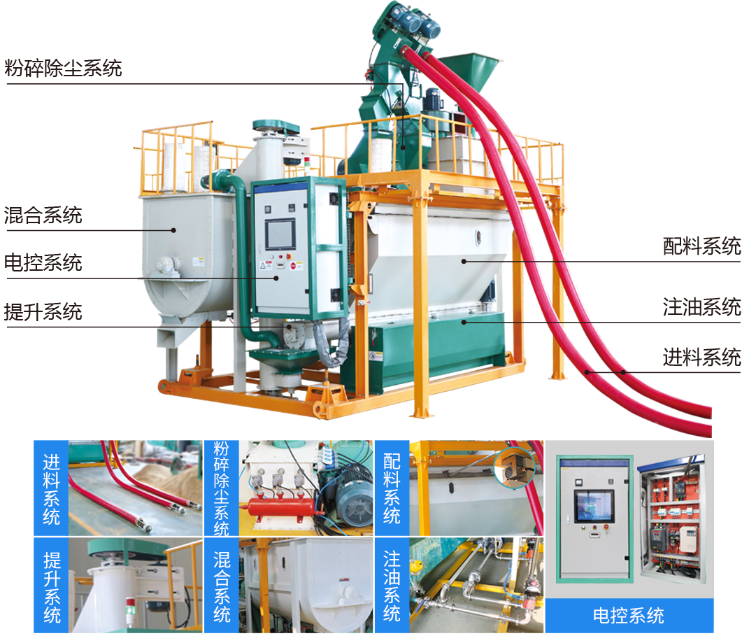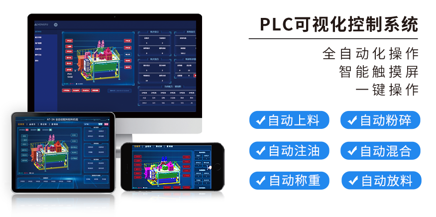 PLC可視化控製係統(tǒng),電腦 / 平板 / 手(shǒu)機全(quán)自動化智能觸摸屏一鍵操作(zuò);自動(dòng)上料、自動粉碎、自動稱重、自動注油、自動混合、自動放料。