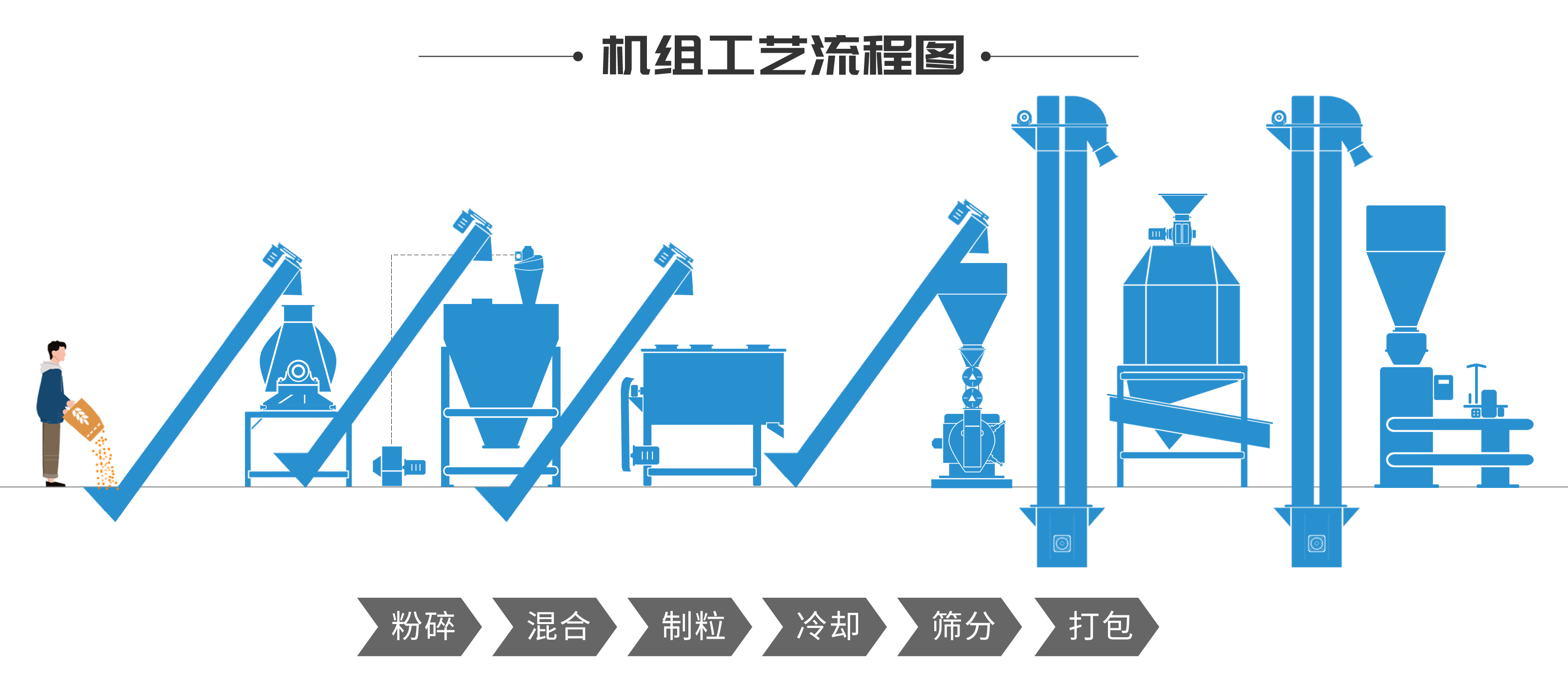 此套飼料加工設備適應範圍廣(guǎng),通用性強,可用於生產豬,牛,羊,兔,雞,鴨等顆粒(lì)飼料。適(shì)用於大、中型飼料廠、養殖廠使用。