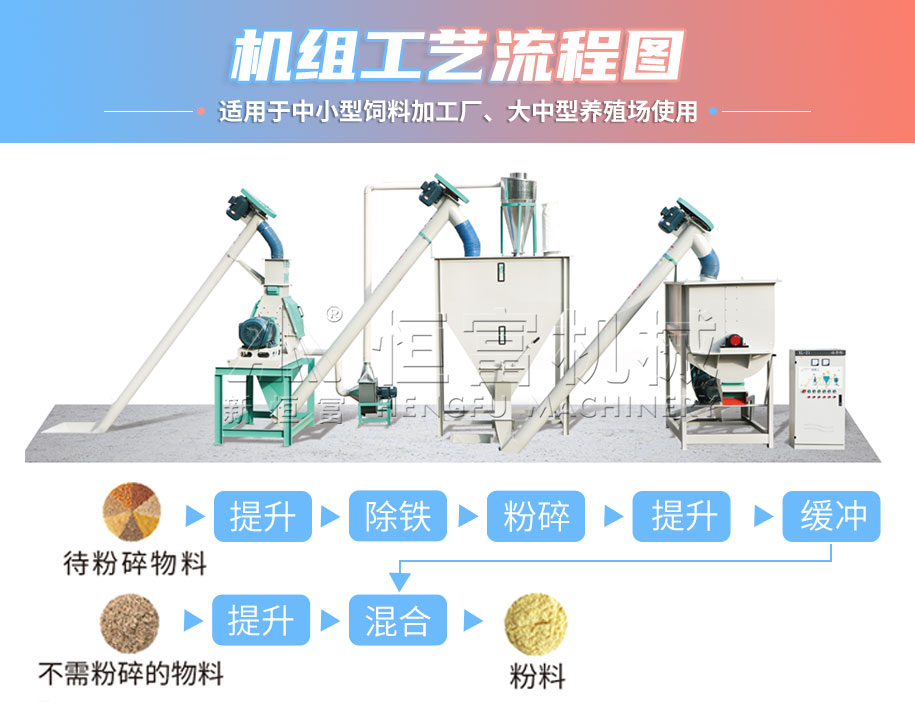 該機組配備的設備(bèi)有:水滴式粉碎機、緩衝倉、單軸雙螺旋(xuán)混合機、提升輸送設(shè)備、除塵(chén)除(chú)鐵設備、電控係統、注油係統、配件等。