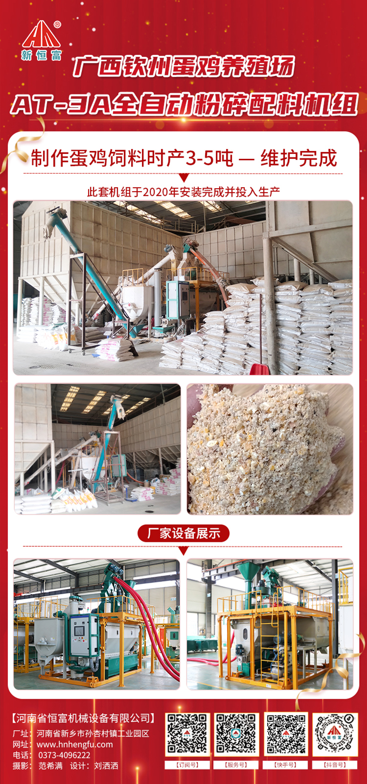 該生產(chǎn)線主要是做蛋(dàn)雞粉狀飼料,前端配備有高效(xiào)飼料粉碎機用於粉碎玉米原料,中間搭配多(duō)個待混倉,用(yòng)於儲存預混料(liào)、石粉、麩皮、豆粕,後端搭配一套AT-3A全自動粉碎(suì)配(pèi)料機(jī)組,可對物料進行集中稱重、配料、注油、混合,混合後的飼料成品直接輸(shū)送(sòng)至成品飼料倉進行存放。該設備適用於各種飼料廠、養殖場使用,可加工濃縮飼料、全價粉狀(zhuàng)飼料等。