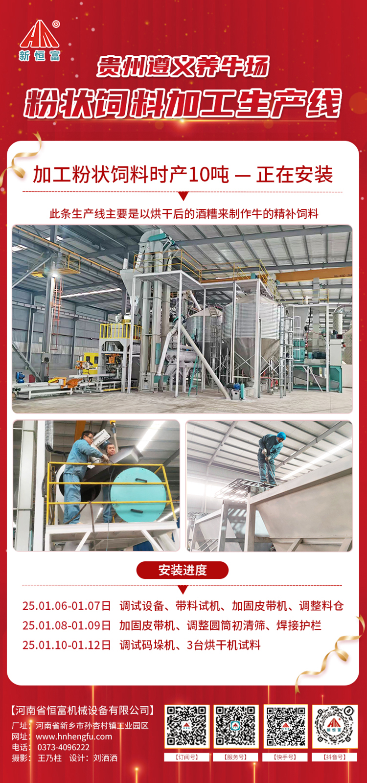 貴州遵義養牛場(chǎng),時產10噸粉狀飼料加工生產線正在安裝。