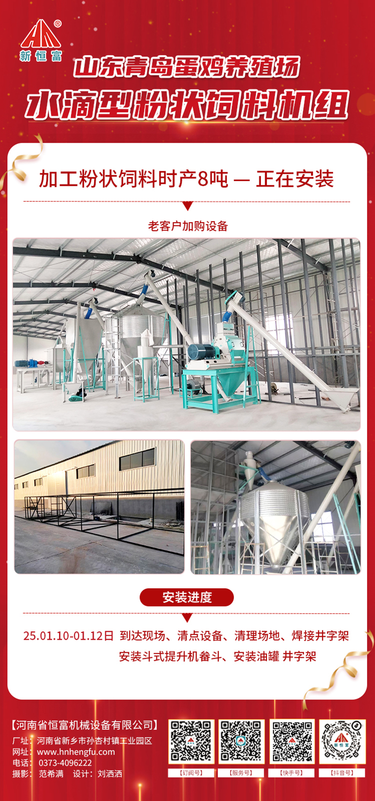 山東青島蛋(dàn)雞養殖場,時產8噸粉狀飼料加工機組(zǔ)正(zhèng)在安(ān)裝。