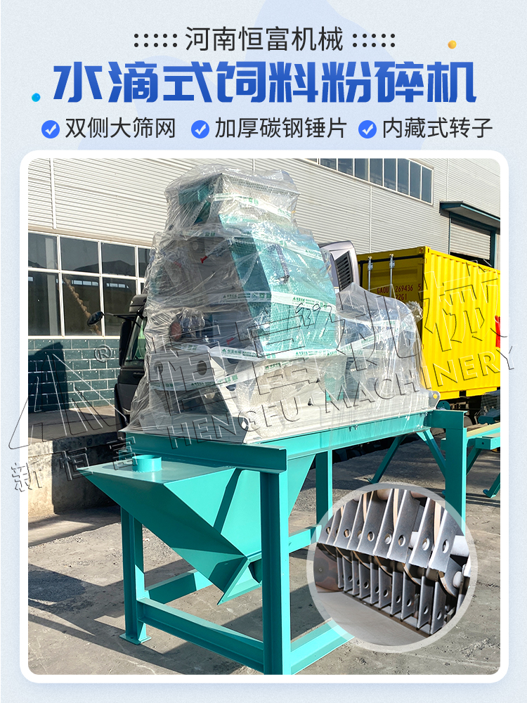 水滴式係列(liè)粉碎機可粉碎各種顆粒狀飼料原料,如玉米、高粱、麥類、破碎後的餅類等物料,可粗粉也可細粉。