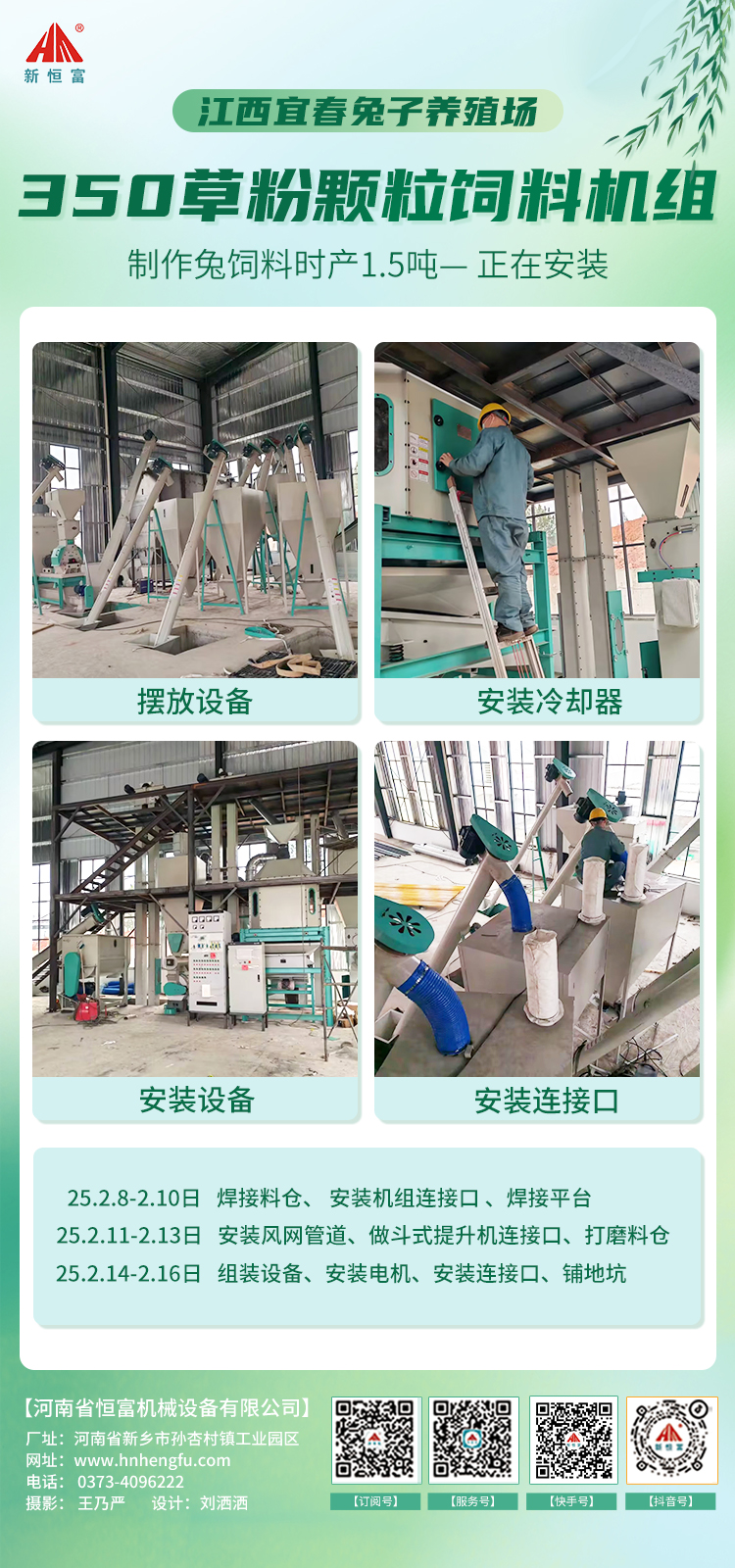 江西宜春兔子養殖場,時產1.5噸草粉顆粒飼料加工機組正在安裝。
