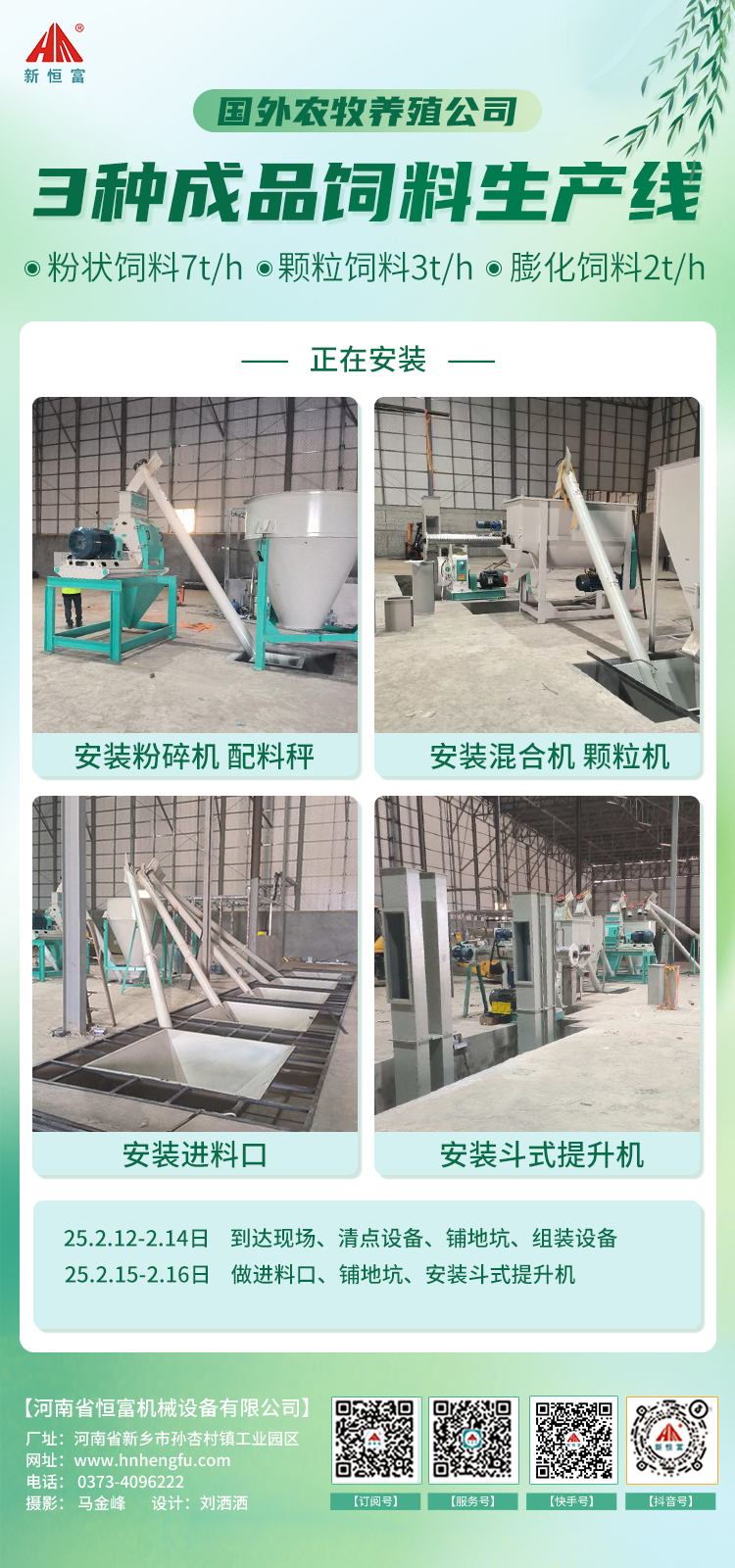 國外(wài)農牧養殖公司(sī),時產(chǎn)2-7噸3種成品飼料(liào)生產線正在安裝。