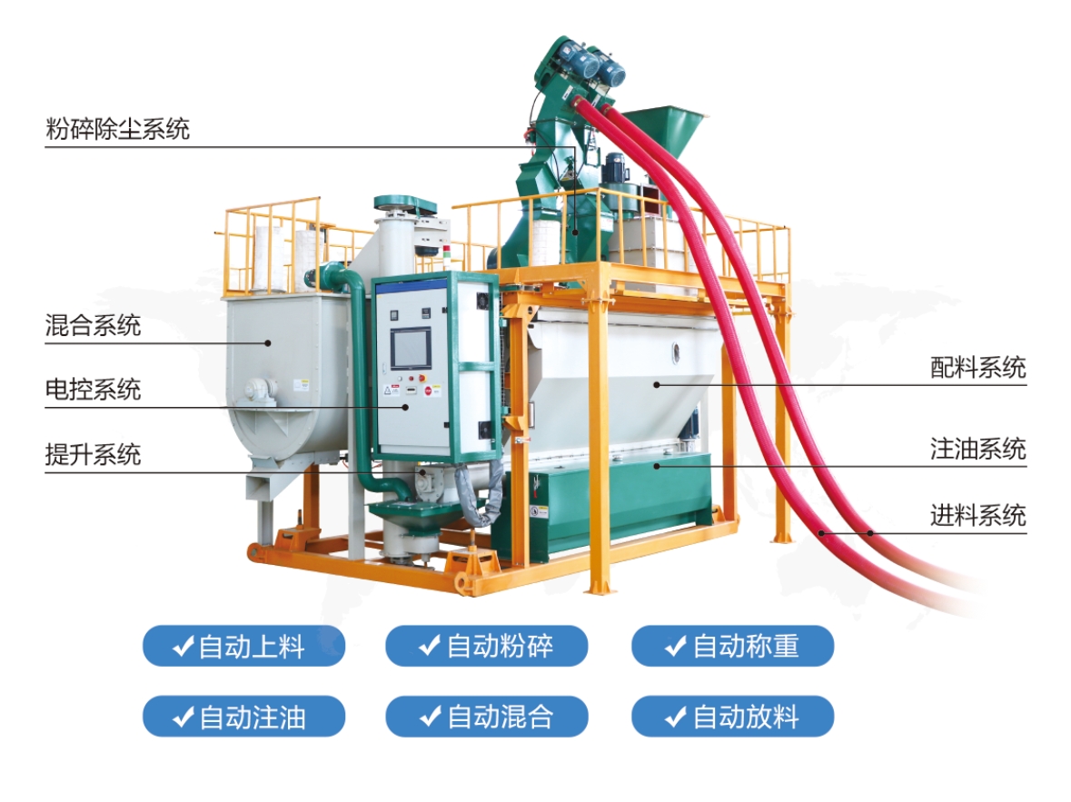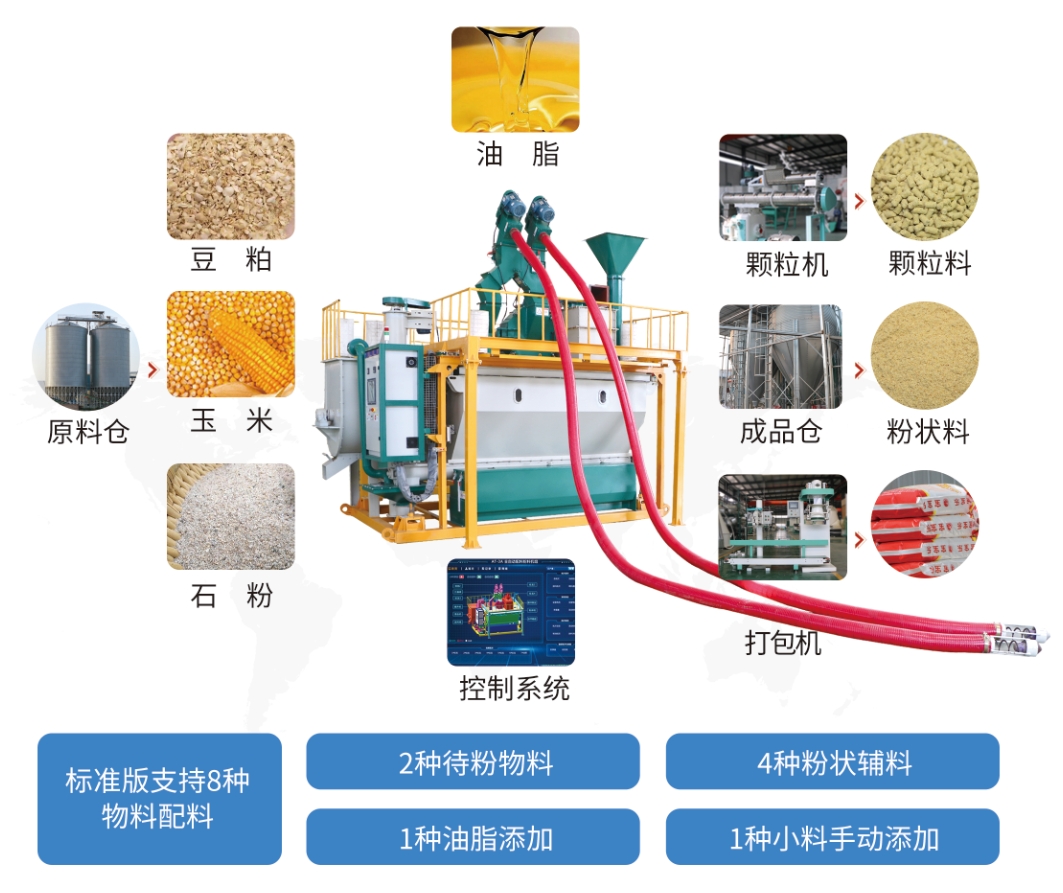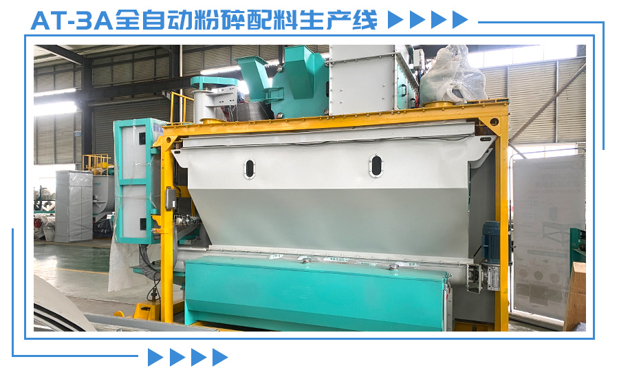 再者,AT-3A全自動粉碎配料機組有諸多優勢(shì),如:占地麵積隻需(xū)14.4㎡;安裝高度不足5m;標準版(bǎn)支持8種物(wù)料配料(liào);機組前後(hòu)可配置倉儲係統、製粒係統、自動包裝係統,組合成(chéng)全價粉料(liào)、顆粒(lì)飼料機組等等。