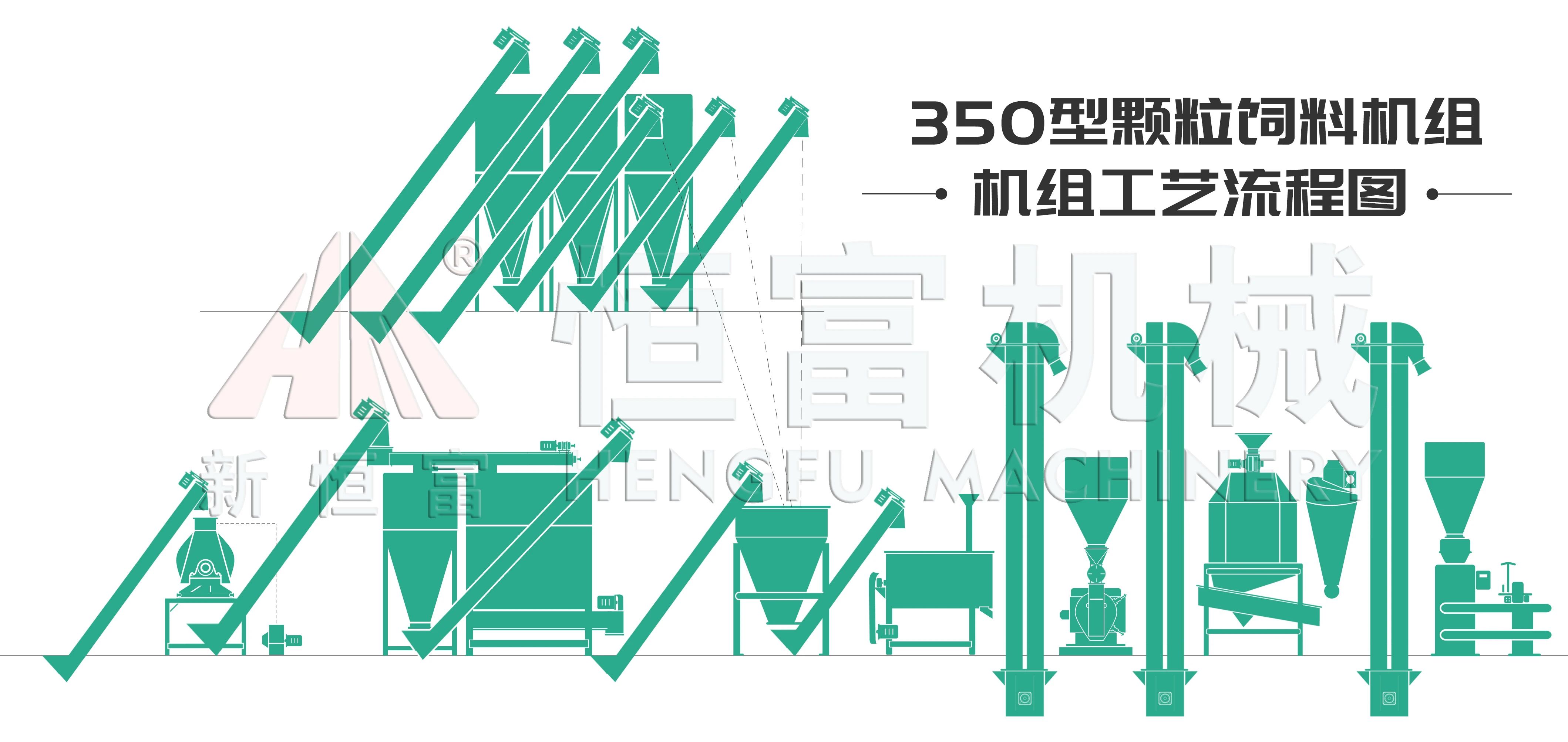 該機組主要是做(zuò)兔飼料,前端搭配有水滴型(xíng)飼料粉碎(suì)機、12m³苜蓿粉倉、3個2m³料倉以及1個2m³配料秤,中間搭配有臥式單軸(zhóu)雙螺帶飼料混合機、環模飼料顆粒機,後端搭(dā)配了逆(nì)流式飼料冷卻器、飼料振動掛篩以及自動(dòng)定量飼料(liào)包裝機等。該(gāi)機組先對玉米進行粉碎,然後將玉米粉、苜蓿(xu)粉(fěn)等(děng)進行稱重、配(pèi)料,隨後進行混(hún)合(hé)、製粒,最後對壓(yā)製出來的成(chéng)品顆粒(lì)飼料進行冷卻、篩分、包裝。本條(tiáo)生產線是一條完整的顆粒飼料加工機組(zǔ),不僅可以做草粉顆粒飼料還可做精糧顆粒飼料。