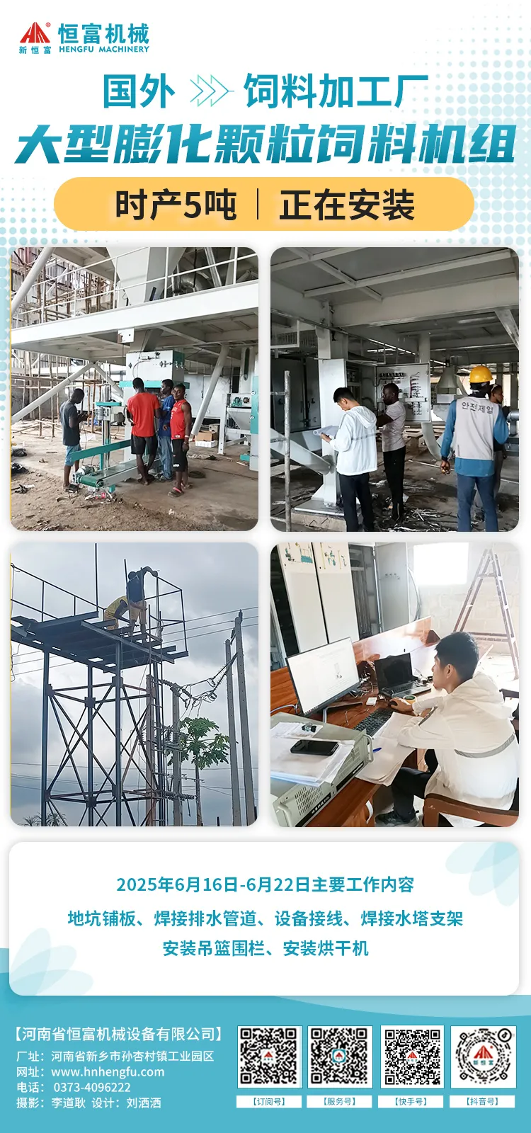 2025年6月(yuè)16日至6月22日主要工作內(nèi)容:接線(xiàn),鋪地坑,焊接排水溝管道和吊籃圍欄,跑線,組裝烘幹機網,焊接水塔支架,清理(lǐ)廢料等。