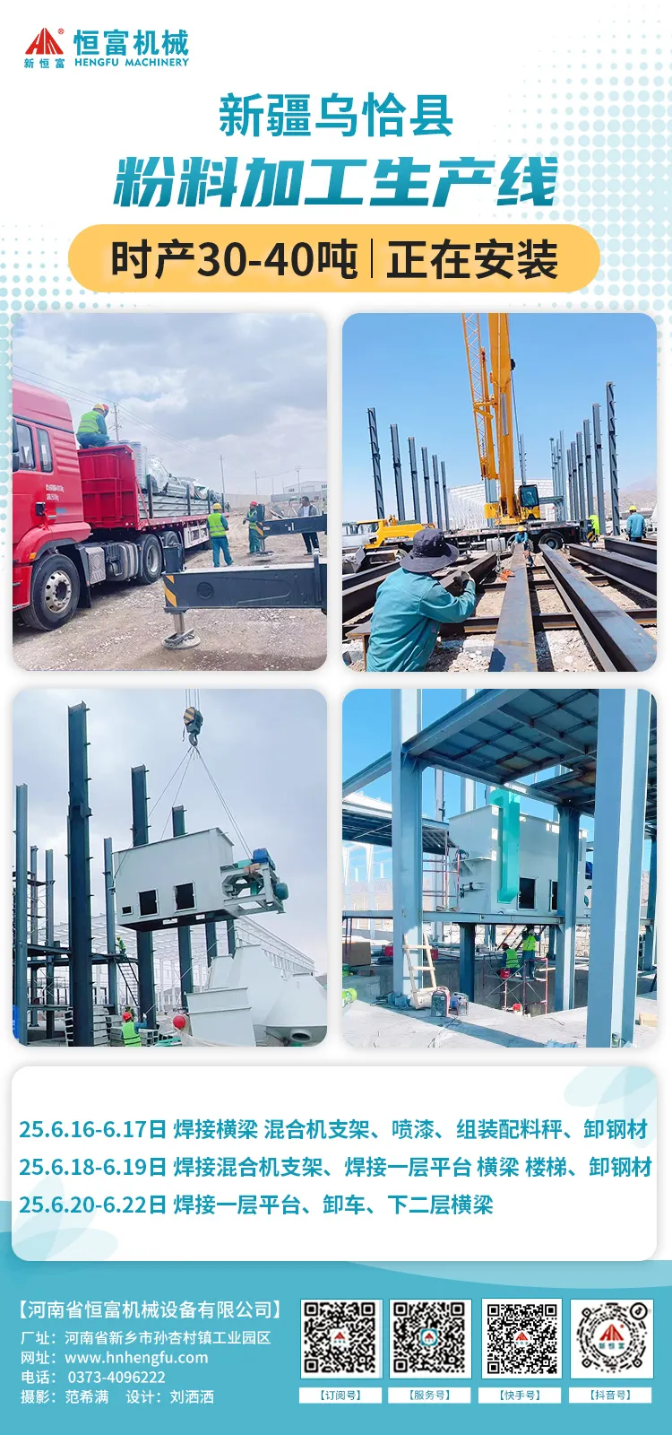2025年(nián)6月16日至6月22日主要工作內容:焊接(jiē)混(hún)合機半層(céng)支架(jià),焊接第(dì)一層平台、樓梯,下二層(céng)橫梁,拚接料倉,卸鋼材等。